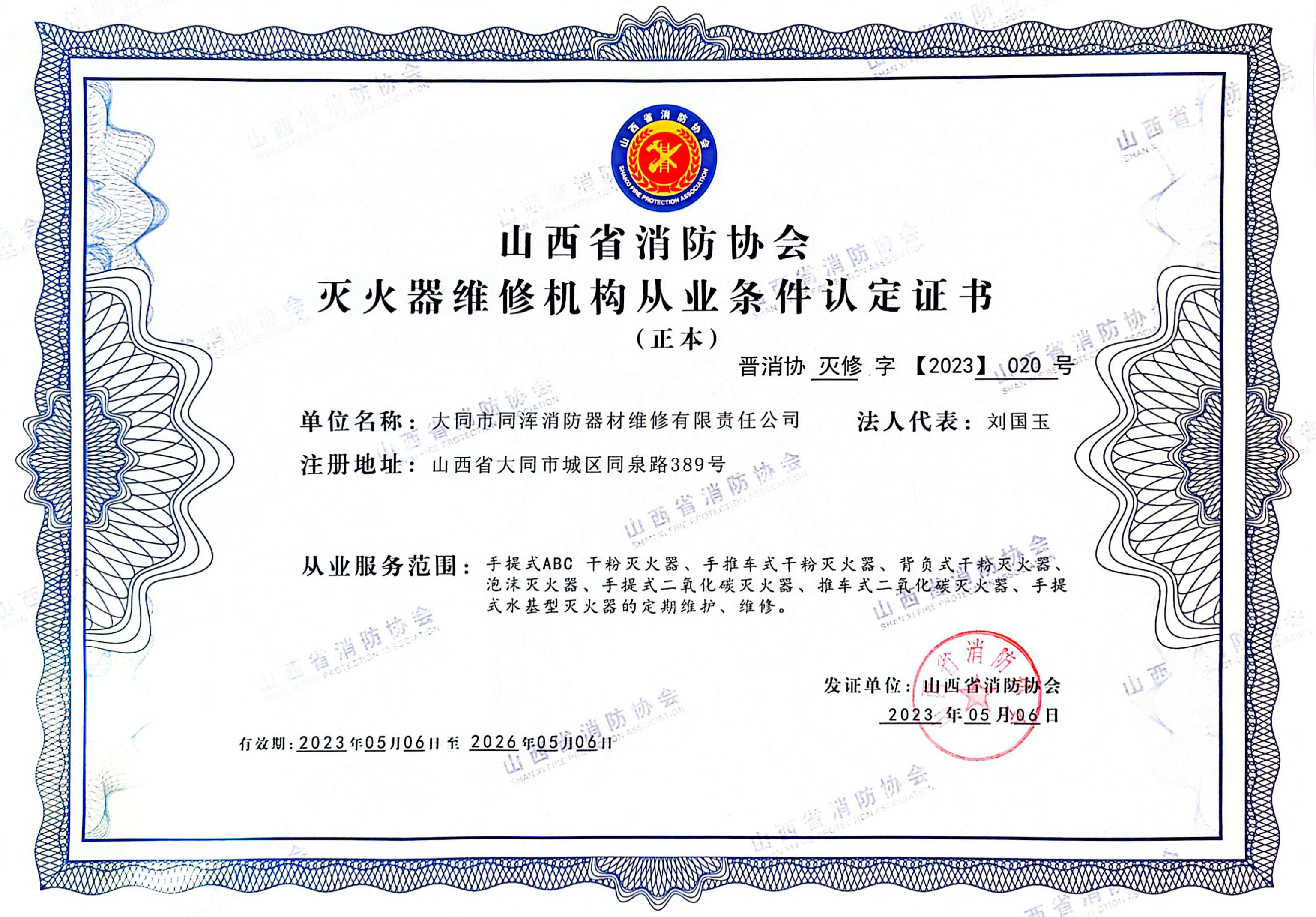 大同市同渾消防器材維修有限責(zé)任公司,位于大同市同泉路389號,始建于2000年,是公安部消防局定點銷售和維修的企業(yè),歷經(jīng)多年的創(chuàng)建、發(fā)展和拼搏,現(xiàn)有多家消防器材廠商供應(yīng)我公司,并有現(xiàn)代化維修設(shè)備,標準的廠房,嚴格的管理,優(yōu)良的設(shè)備,良好的服務(wù)并受到各行各業(yè)的好評。總經(jīng)理劉國玉嚴格管理,嚴格要求,精益求精,認真負責(zé),帶領(lǐng)團隊熱烈歡迎各界朋友顧客光臨。